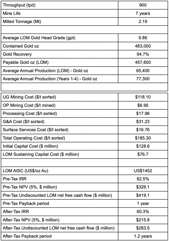 Table 2: Scottie Gold Mine DSO PEA Summary (Base Case), assumes a 5% discount rate and a gold price of US$2600.