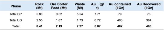 Note: BB = Blueberry, OP = open pit, UG = underground, Au = gold grade (g/t), Mt = million tonnes, kOz = thousand ounces