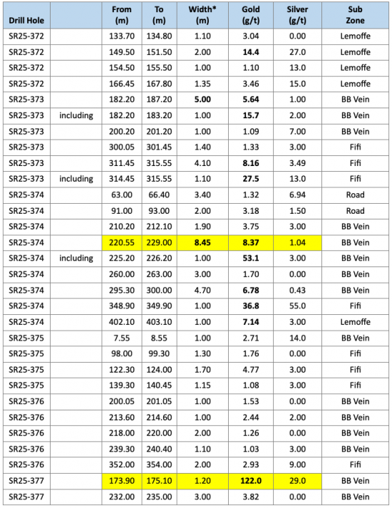 - Blueberry Contact drillhole SR25-374 intersected 8.37 grams per tonne (g/t) gold over 8.45 metres (m), including 53.1 g/t gold over 1.0 m at the Blueberry vein zone. The hole also intercepted an additional Blueberry zone vein grading 6.78 g/t gold over 4.7 m (Table 1, Figures 1,2,3).
