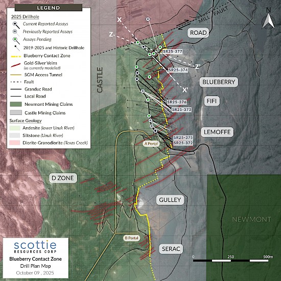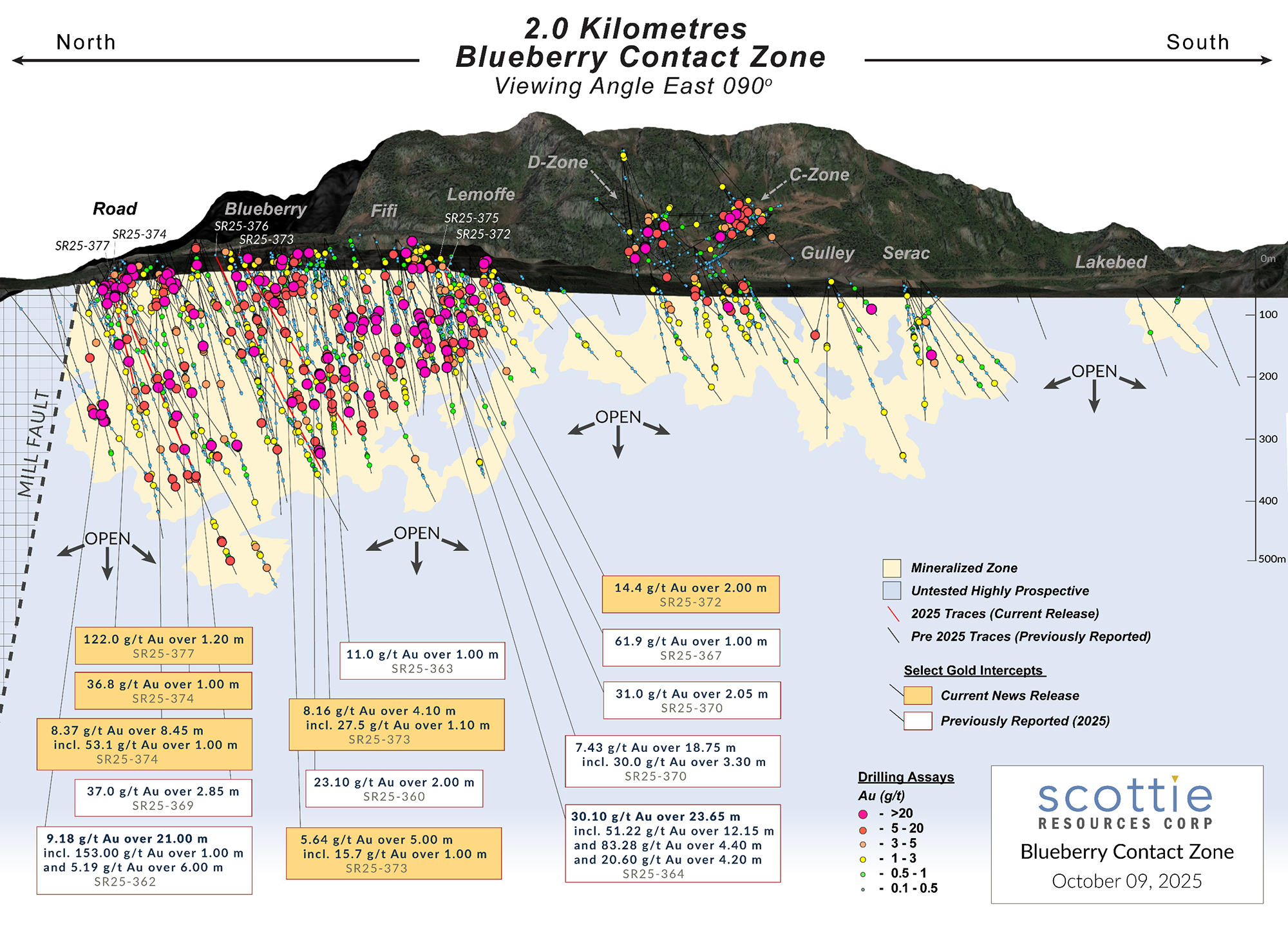 Vancouver, BC – October 9, 2025 – Scottie Resources Corp. (“Scottie” or the “Company”) (TSXV: SCOT OTCQB: SCTSF FSE:SR80) is pleased to report new assays from its 2025 drilling of the Blueberry Contact Zone within the Scottie Gold Mine Project. The road-accessible Scottie Gold Mine Project, which includes the 100%-owned past-producing Scottie Gold Mine and the adjacent Blueberry Contact Zone, is located 35 kilometres north of Stewart, BC.