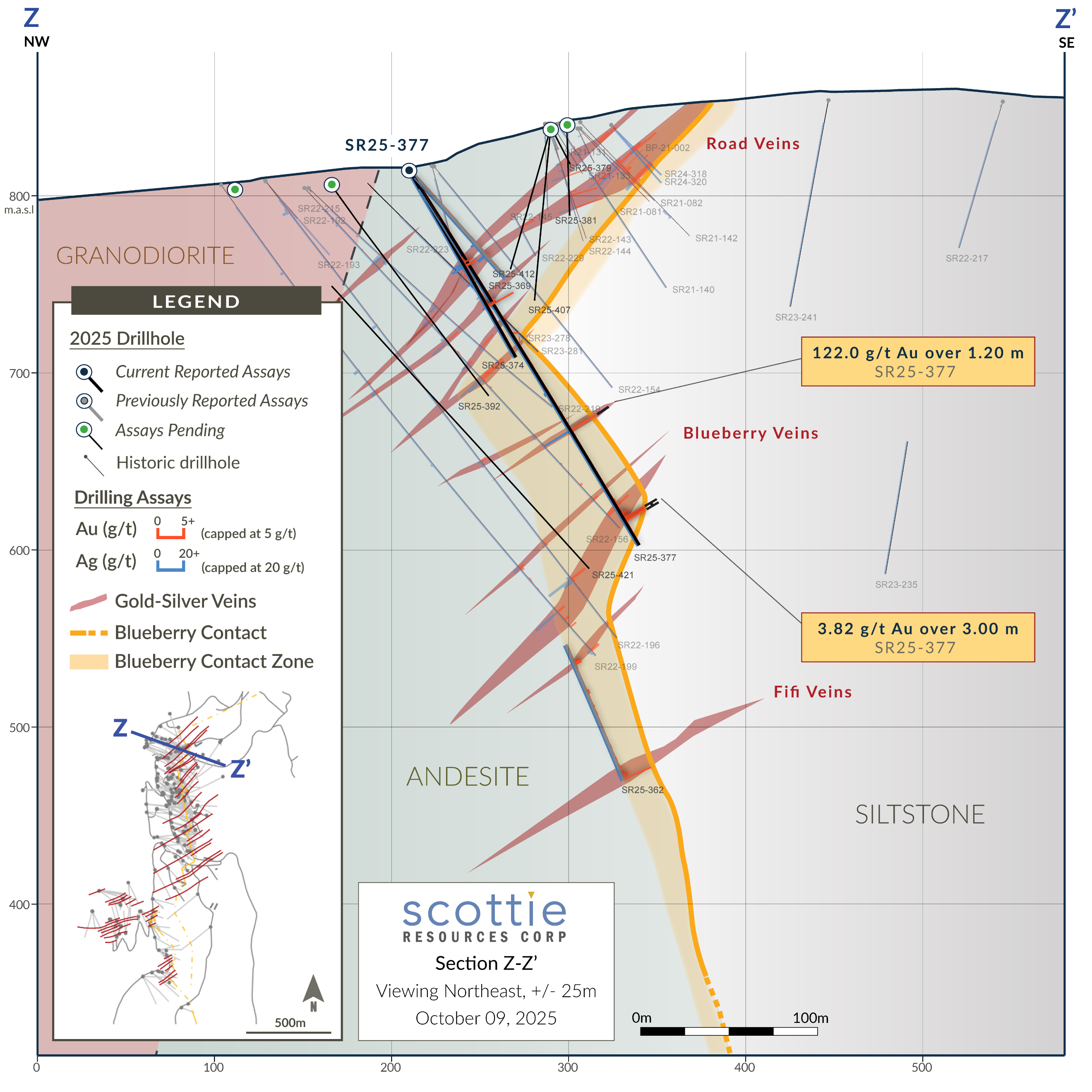 - Blueberry Contact drillhole SR25-377 intersected 122.0 g/t gold over 1.2 m at the Blueberry vein zone (Table 1, Figures 1,2,4).