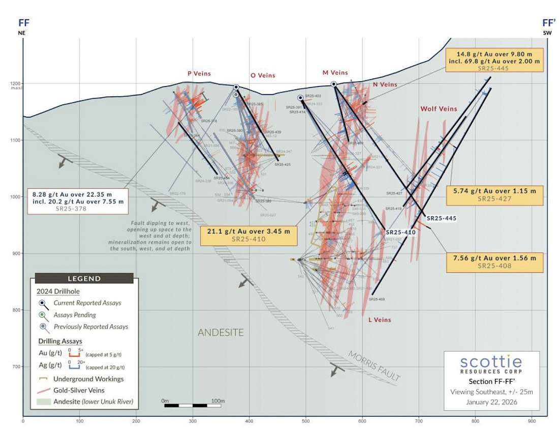 Figure 2: Cross-section displaying Scottie Gold Mine intercepts from drill holes SR25-408, -410, -427, -445.