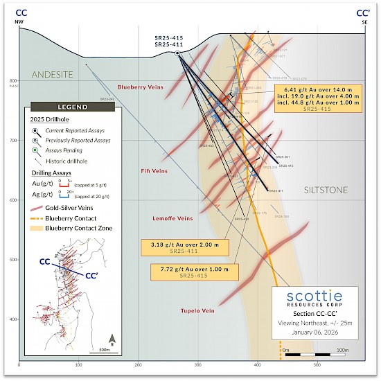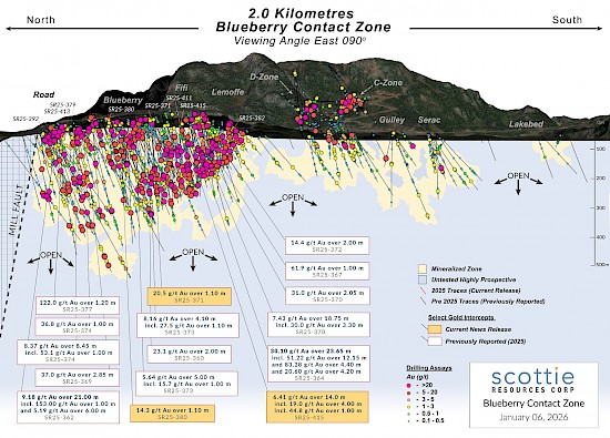 Vancouver, BC – January 6, 2026 – Scottie Resources Corp. (“Scottie” or the “Company”) (TSXV: SCOT OTCQB: SCTSF FSE:SR80) is pleased to report new assays from its 2025 drilling of the Blueberry Contact Zone within the Scottie Gold Mine Project (“Scottie Gold Mine” or the “Project”). The road-accessible Scottie Gold Mine Project, which includes the 100%-owned past-producing Scottie Gold Mine and the adjacent Blueberry Contact Zone, is located 35 kilometres north of Stewart, BC, and is the subject of a newly released Preliminary Economic Assessment (“PEA”) (Bird et al., October 28, 2025, Scottie Gold Mine Project, SEDAR+).