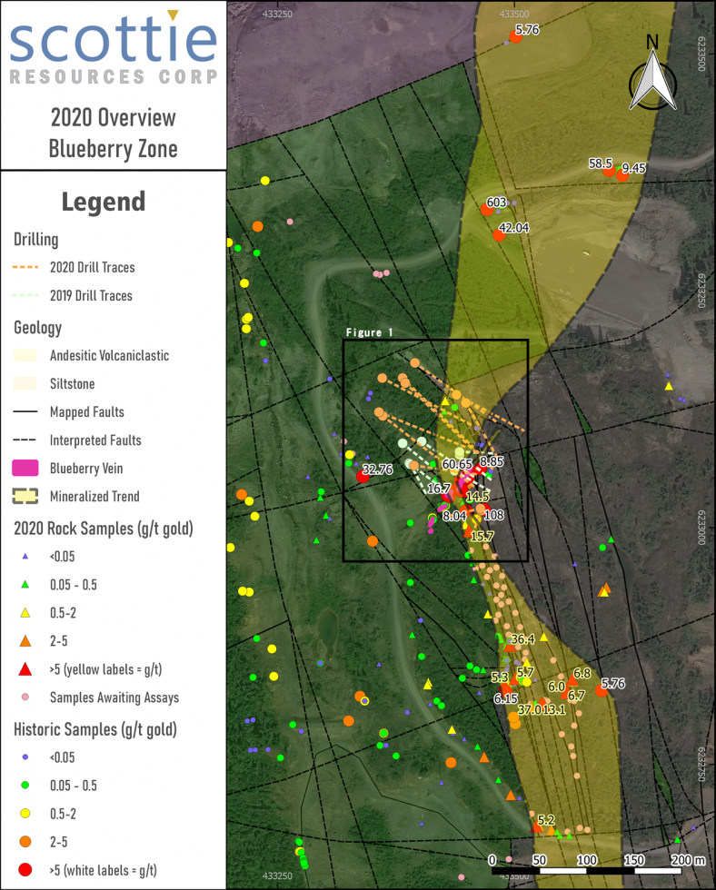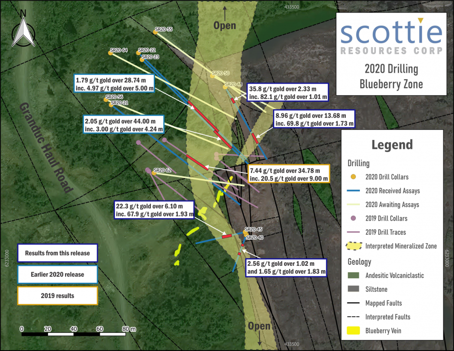 Vancouver, BC – December 8, 2020 – Scottie Resources Corp. (“Scottie” or the “Company”) (TSXV: SCOT) is pleased to report new assay results for the Blueberry Zone, including the discovery of a new mineralization trend that runs oblique to the historic Blueberry Vein target. Intersection of multiple high-grade intervals along strike (including 22.3 g/t gold over 6.1 m), define an intensely mineralized gold trend oriented north-south. This new target remains open along strike and depth, with numerous high-grade grab samples delineating a zone that exceeds 800 metres in strike length. The Blueberry Zone is located on the Granduc Road, 2 km north-northeast of the past-producing high-grade Scottie Gold Mine.