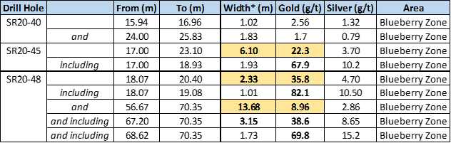 Drill holes SR20-40 and -45 were designed confirm that the high-grade mineralizing trend continues to the south of the north-north east oriented Blueberry vein. These two short holes (42.5 and 54.4 metres, respectively) were drilled at -45°, and intercepted near surface mineralization including 67.9 g/t gold and 10.2 g/t silver over 1.93 meters.