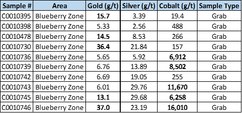 Preliminary results from the 2020 mapping and sampling program include numerous high-grade grab samples occurring along a broad N-S trend, south of the Blueberry Vein (Table 2, Figure 2). These results, coupled with multiple historically sampled high-grade showings to the north of the vein (Figure 2), suggest that the potential strike length of the mineralizing trend exceeds 800 meters. Many of the high-grade gold samples are associated with very strong cobalt mineralization, with values in excess of 1% Co (Table 2). Over 60 grab samples from the Blueberry Zone are still pending assay results.